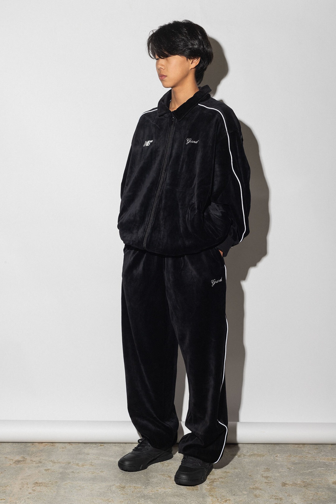 セットアップで着られるベロアのトラックパンツ。上質でシンプルな素材に両ブランドのネーム刺繍。GRAND COLLECTIONらしい都会的なアイテム。