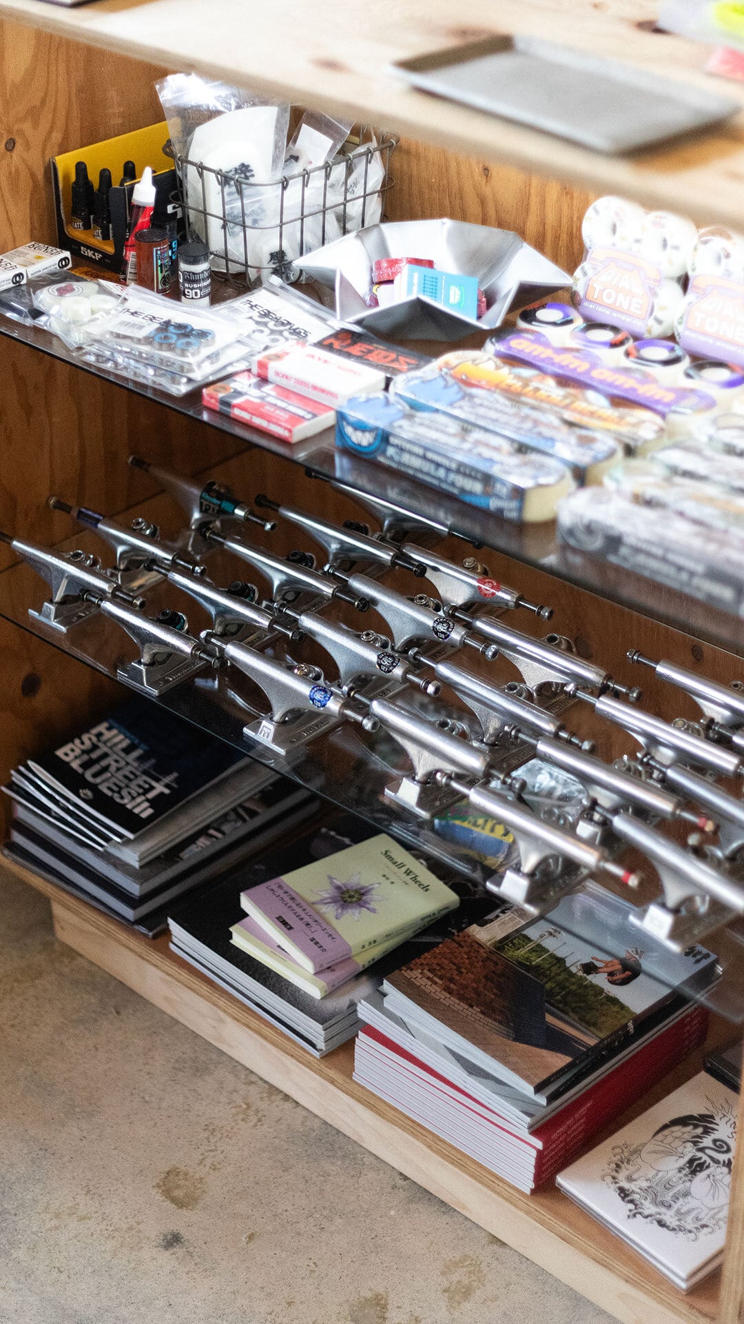 すべて、プロが使っている最高品質のパーツを使っています。僕はもちろん、いつもお店に来てくれるスケーターたちも、同じ品質のものを使っています。パーツには、グレードがあって、これよりも価格が高くて高品質のものもあります。どんなスケートボードにしたいかというご希望があれば、お気軽にお伝え下さい。